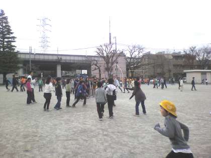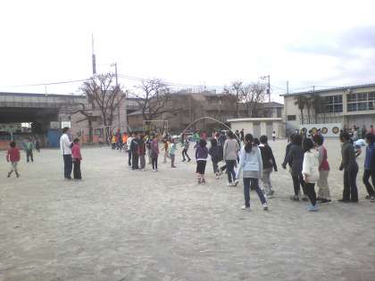 校庭で大なわの練習をしているクラスがいました。みんな気持ちを一つにしてがんばっていました。(12月21日)