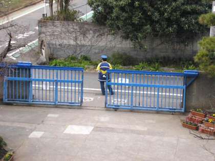 子どもたちが登校している間、警備員の方が学校のまわりを巡回しています。