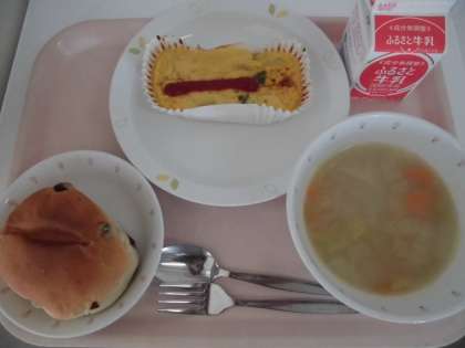 今日のオムレツはスペイン風です。じゃがいも、たまねぎ、にんじん、ピーマンを入れ、野菜たっぷりに作りました。見た目も鮮やかですね!