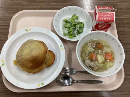 ビスキーパンは、子どもたちにとっても人気のパンです。中にはいちごジャムをはさみ、上からはビスケット生地をかけました。甘い香りが学校中に広がりました。