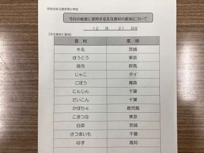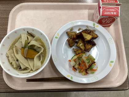 明日は「冬至」ということで、かぼちゃとゆずを使った献立です。あつあつのほうとうは、寒い今日にぴったりでした。
