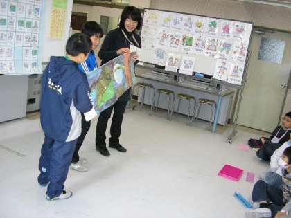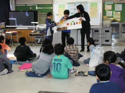 今度、グループごとに絵本をつくるための準備として「はらぺこあおむし」の話を英語で聞きました。(1月26日)