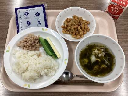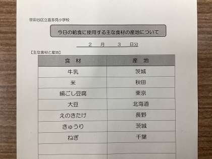 節分献立です。自分で巻いて作る恵方巻と、豆まきの大豆を使ったおかずを作りました。品数が多かったので配膳が大変そうでしたが、子どもたちは嬉しそうにオリジナルの恵方巻を作っていました。
