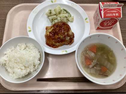 給食のハンバーグは、豚ひき肉と豆腐を合わせて使っています。豆腐を入れることで、ふっくらとやわらかく、また豆腐もお肉や玉ねぎのうま味を吸っておいしくなります。