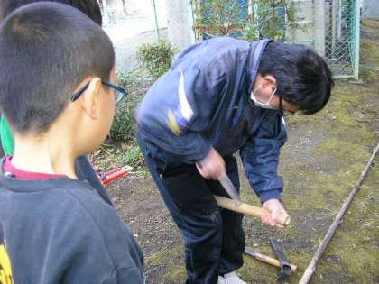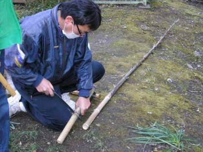 川場で体験した竹とんぼを4年生に伝えるため、主事さんに竹を切っていただいて作っています。(2月10日)