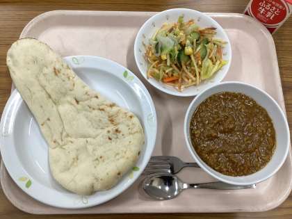 キーマカレーは、「ひき肉のカレー」という意味です。ひき肉と細かく刻んだ野菜、そして6種類のスパイスを入れて煮込みました。ナンにつけて、おいしくいただきました。