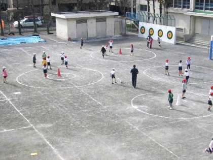 二人組でボールをけりをした後、グループごとにコーンめがけてボールをける練習をしました。(2月28日)