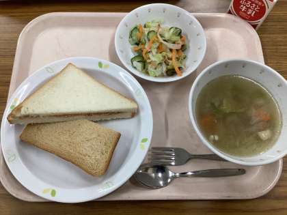 今日は2種類のサンドイッチです。少し黒い食パンにはクリームチーズを、白い食パンにはいちごジャムをはさみました。