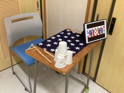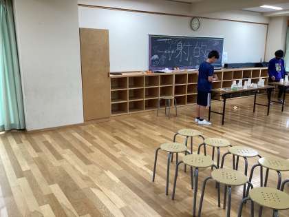受付では、受付担当とお客さん役でシュミレーションしたり、射的や迷路を作りました。