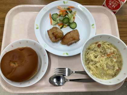 6月16日の給食 公開日 2023/06/16 更新日 2023/06/16 給食 (今日の献立) ・黒砂糖パン ・トマトと卵のスープ ・チキンソテー ・コールスローサラダ ・牛乳 生のトマトを使って、スープを作りました。旬を迎えたトマトは、甘味がつよく、卵との相性も抜群です。