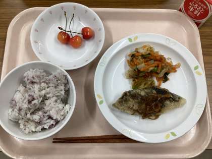 6月19日の給食 公開日 2023/06/19 更新日 2023/06/19 給食 (今日の献立) ・ゆかりごはん ・あじの南蛮揚げ ・野菜のおかか和え ・さくらんぼ ・牛乳 今日はデザートに旬のさくらんぼを出しました。今年初めて食べる子も多く、おかわりじゃんけんが盛り上がっていました!