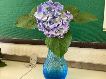 見頃をむかえている「あじさい」の花をイメージしたゼリーを作りました。ぶどうジュースのゼリーとカルピスのゼリーを四角く切ってシロップに浮かべています。見て美しく食べておいしいゼリーです!