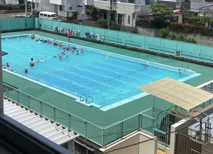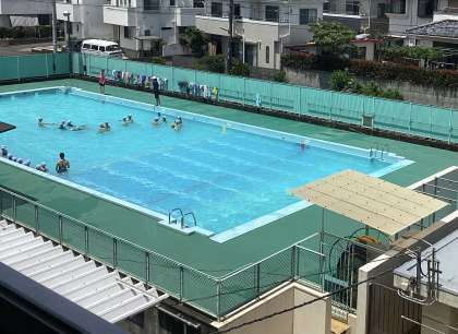 プールの中に入って、じゃんけんをしたり、 2人1組になって、蹴伸びやバタ足の練習をしました。