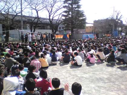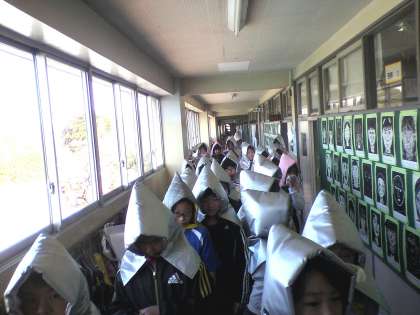 今日は、予告なしの避難訓練がありました。昼休み中だったので、校舎内にいた子どもや校庭で遊んでいた子どもがいました。教室にいた子どもたちは、防災頭巾をかぶりおちついて避難することができました。(3月13日)