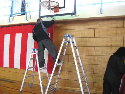 主事さんが、体育館に紅白幕をつけています。卒業式の練習も順調に進んでいます。(3月16日)
