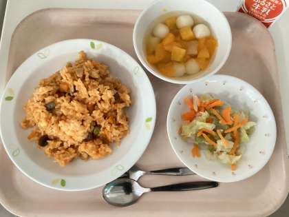 9月7日の給食 公開日 2023/09/07 更新日 2023/09/07 給食 (今日の献立) ・チーズ入りチキンライス ・フレンチサラダ ・白玉フルーツポンチ ・牛乳 チキンライスには、バターとチーズを入れてコクのある味にしています。子どもたちから人気のメニューです。