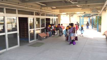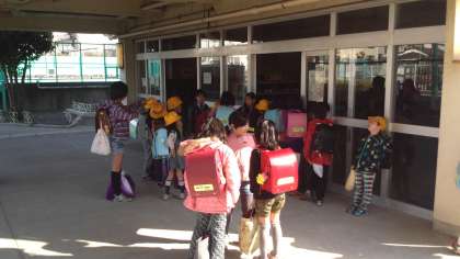 時間になるまで、昇降口の入り口付近で待っています。(4月9日)