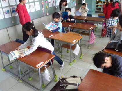 教室に入った1年生は、自分の荷物を片付けたり名札を用意したりしています。(4月12日)