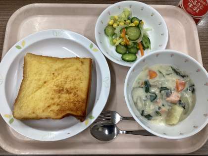 11月6日の給食 公開日 2023/11/06 更新日 2023/11/06 給食 (今日の献立) ・フレンチトースト ・鮭ときのこのクリームシチュー ・コーンサラダ ・牛乳 フレンチトーストは、食パンの片面に卵液を浸して、ふんわりと焼き上げています。バニラの甘い香りが廊下に広がりました。