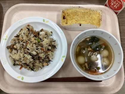11月14日の給食 公開日 2023/11/14 更新日 2023/11/14 給食 (今日の献立) ・豆入りひじきごはん ・白玉じる ・切干大根の卵焼き ・牛乳 和食のメニューです。汁物には、もちもちの白玉餅を入れています。新メニューでしたが、おいしい!とたくさん食べてくれました。