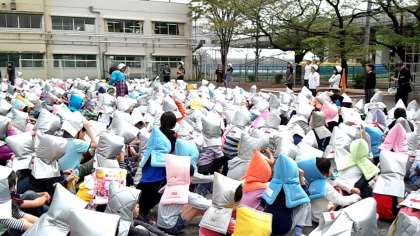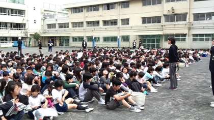 今年度初めての避難訓練がありました。1年生は、上級生のお兄さんやお姉さんが行っていることを見ていました。(4月25日)