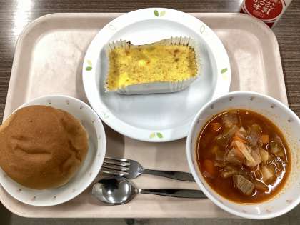 12月18日の給食 公開日 2023/12/18 更新日 2023/12/18 給食 (今日の献立) ・ぶどうパン ・ミネストローネ ・ツナとチーズのオムレツ ・牛乳 ミネストローネは、お肉や野菜、豆などを入れ、具だくさんに作っています。色々な食材のうま味が出てコクのある味になりました。