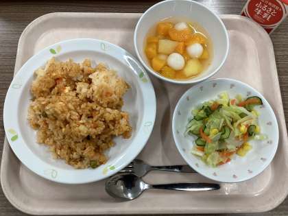 3月4日の給食 公開日 2024/03/04 更新日 2024/03/04 給食 (今日の献立) ・チーズ入りチキンライス ・コーンサラダ ・白玉フルーツポンチ ・牛乳 コーンサラダのドレッシングには、おろしたまねぎを使いました。野菜によく絡み、さっぱり感がおいしいドレッシングです。