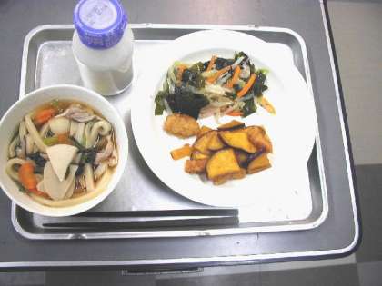 今日の給食 公開日 2012/05/16 更新日 2012/05/16 その他の教育活動 たくさんうどんがあり、みんなおかわりをしていました。(5月15日) 《今日の食材産地》 鶏肉:宮崎 人参:徳島 ねぎ:茨城 さつま芋:千葉 キャベツ:茨城 もやし:栃木 小埼菜:埼玉