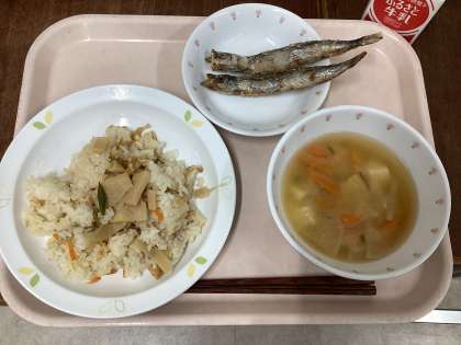 4月30日の給食 公開日 2024/04/30 更新日 2024/04/30 給食 (今日の献立) ・たけのこごはん ・呉汁 ・ししゃものからあげ ・牛乳 旬のたけのこで、たけのこごはんを作りました。今日は、水煮ではなく生のたけのこを使ったので、香りと食感をよりつよく感じることができました。