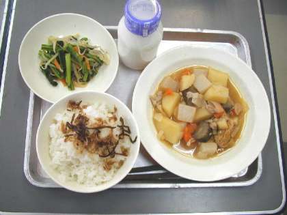 今日の給食 公開日 2012/06/05 更新日 2012/06/05 その他の教育活動 今日は、煮物がでました。(6月4日) 《今日の食材産地》 ちりめんじゃこ:兵庫 小松菜:東京 ごぼう:熊本 人参:千葉 じゃが芋:長崎 玉ねぎ:兵庫 もやし:栃木 こんにゃく:群馬 鶏肉:宮崎