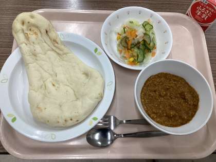 9月6日の給食 公開日 2024/09/06 更新日 2024/09/06 給食 (今日の献立) ・ナン ・キーマカレー ・コーンサラダ ・牛乳 キーマカレーには、刻んだ大豆を入れています。食感はお肉のようなので食べやすく、しっかり栄養をとることができます。