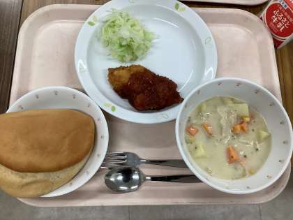 「チャウダー」は、アメリカ生まれの料理です。魚介類を入れたシーフードチャウダーや、トマトを入れたトマトチャウダーなどがありますが、今日はとうもろこしをたっぷり入れたコーンチャウダーにしました。ほんのり甘味を感じるやさしい味です。