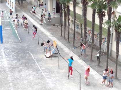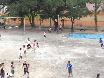 休み時間は、ボール遊びの他にブランコや一輪車、竹馬で遊んでいるこどもがたくさんいます。(6月8日)