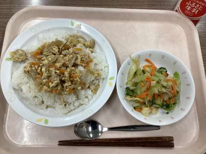 10月8日の給食 公開日 2024/10/08 更新日 2024/10/08 給食 (今日の献立) ・親子丼 ・ピリ辛やさい ・牛乳 親子丼は少し甘めの味付けです。基本の食材に加え、ごぼうやにんじん、こんにゃくも入り、栄養もバッチリです。