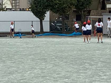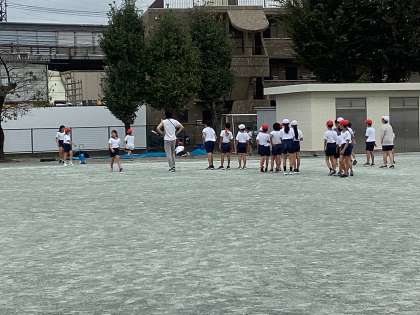 先生のお手本を見て、遠くに跳べた児童には、「おー。」と歓声が上がっていました。
