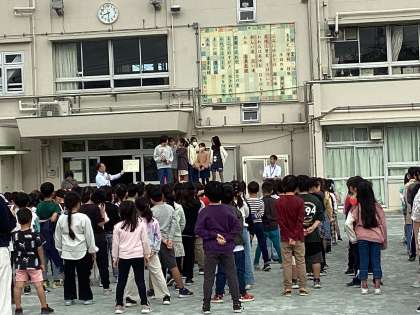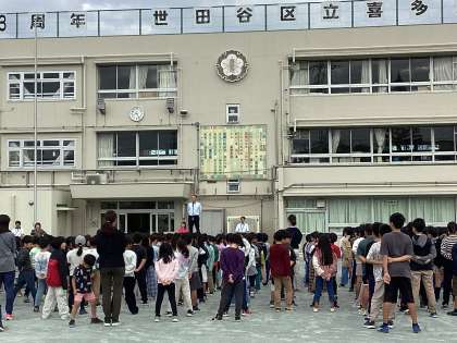 校長先生から、ブラックラムズ東京と駒澤大学の方たちが、挨拶運動のお手伝いをしてくれることについてお話がありました。