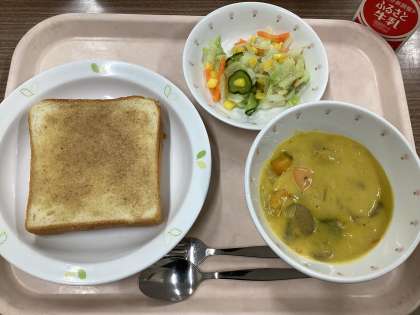 10月30日の給食 公開日 2024/10/30 更新日 2024/10/30 給食 (今日の献立) ・セサミトースト ・パンプキンシチュー ・コーンサラダ ・牛乳 今日のシチューには、かぼちゃをたっぷり入れました。かぼちゃの黄色が見た目もおいしそうです。お肉や野菜、きのこも入っているので、栄養もバッチリです!