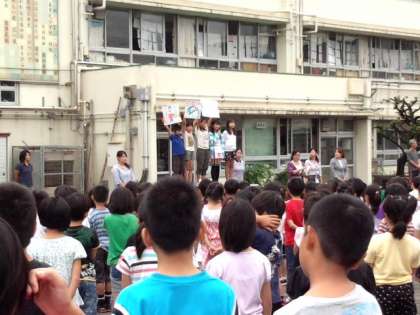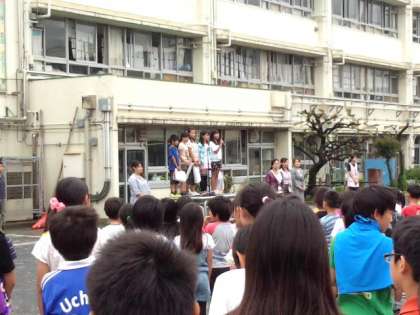児童朝会で、ペットボトルキャップ集めのお願いがありました。(7月2日)