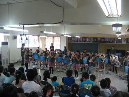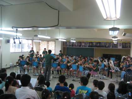 喜多見小学校金管バンドクラブの定期演奏会。合唱やダンスも交え、満員御礼のにぎわいでした。(7月21日)