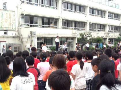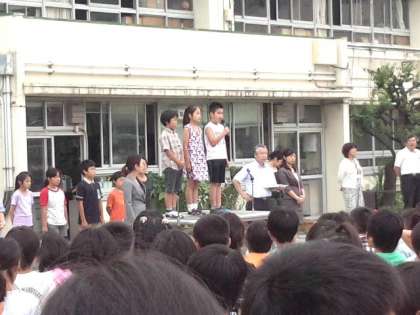 校庭で行いました。児童代表が1学期を振り返りました。(7月20日)