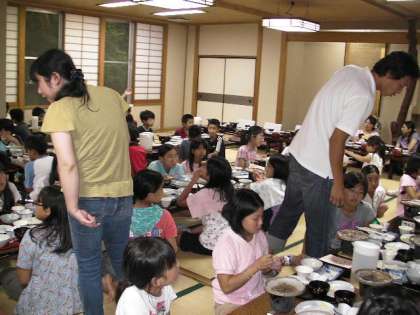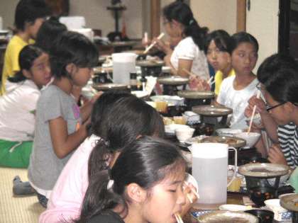 夕食は大広間で食べました。ご飯をおかわりする子どもがたくさんいました。(7月28日 18時)