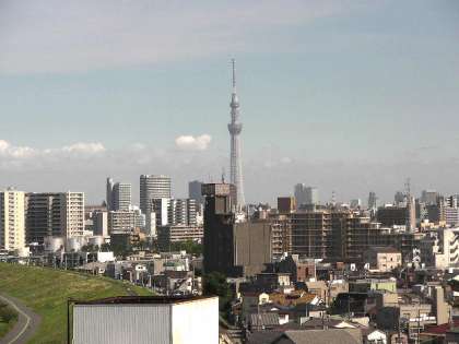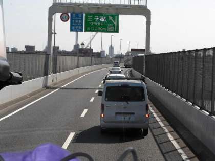 遠くに、スカイツリーが見えます。高速道路は順調です。(7月30日 15時05分)
