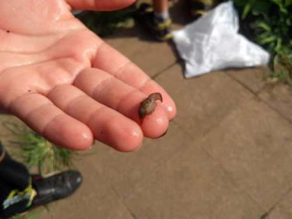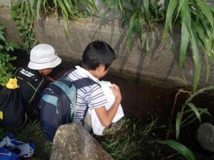 学校の近くにはわき水のような物が流れています。その場所で、子どもたちはザリガニを捕まえています。(8月5日)