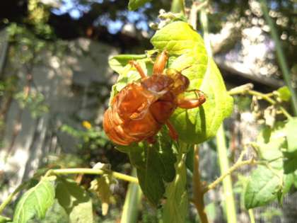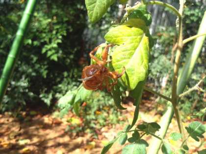 3年生が育てているトマトの葉にセミの抜け殻がありました。(8月18日)