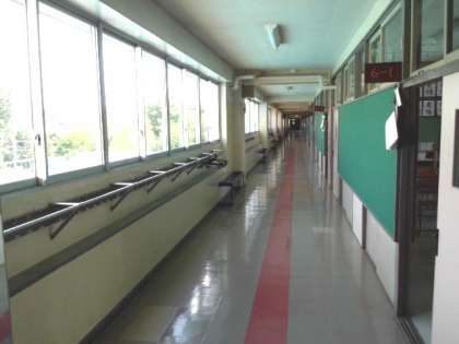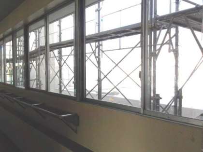 給食室の工事に伴って、校舎外側には骨組みが組み立てられています。(8月15日)