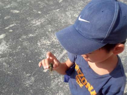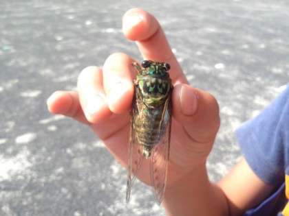 BOPに来た子どもが、ミンミンゼミをつかまえました。羽の色が透明なのでミンミンゼミと教えてくれました。(8月19日)