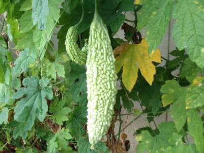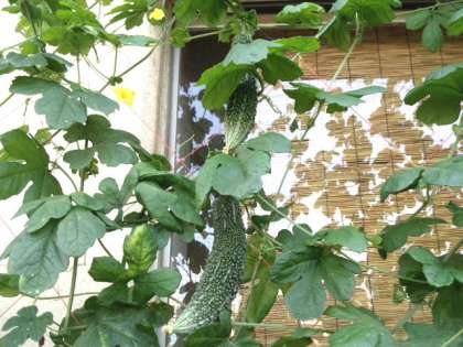 葉が生い茂り、ゴーヤが実っています。(8月28日)
