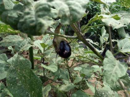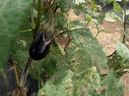 葉が虫に食べられ始めていますが、ナスが育っています。(8月29日)