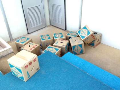 夜中の地震により、プール施設にあった空箱が散乱していました。校舎内に異常はありませんでした。(9月14日)