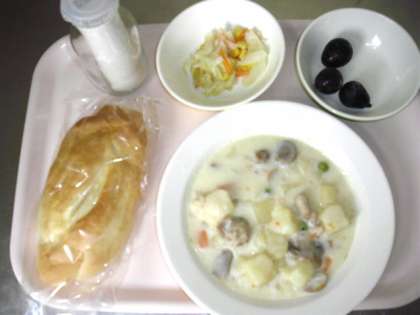 今日のソフトフランスパンの真ん中には、バターが入っていました。コーンたっぷりのサラダが人気でした。(9月21日)